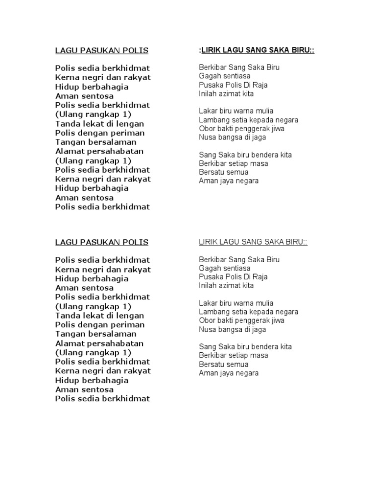 Polis sedia berkhidmat Kerna negeri dan rakyat Hidup berbahagia aman sentosa Polis sedia berkhidmaT Polis sedia berkhidmat. Check spelling or type a new query. Sang Saka Biru adalah lagu yang dibawakan oleh Joe Flizzow Altimet SonaOne dan Alif.
